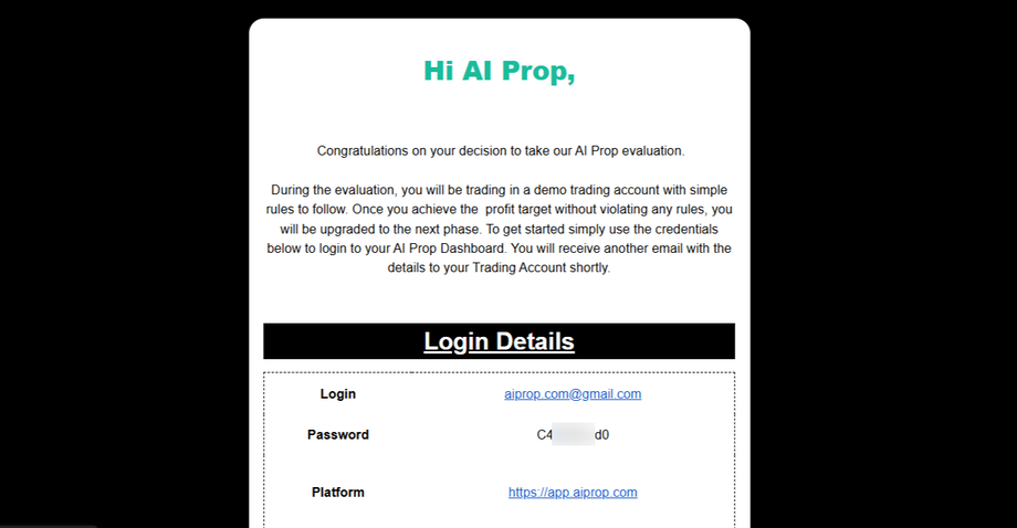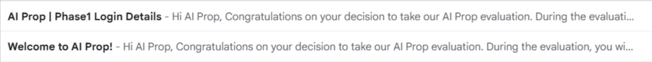 The first email will contain your login credentials (username and password) for accessing your user dashboard at https://app.aiprop.com/