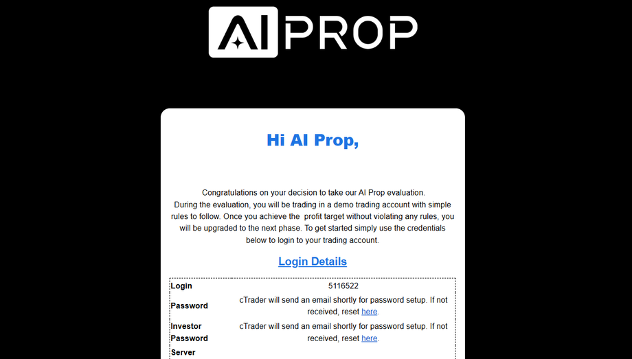 In the second email, you will receive the login information and password for your trading account. AI Prop utilizes trading facilities from the esteemed broker Coinstrat Pro.